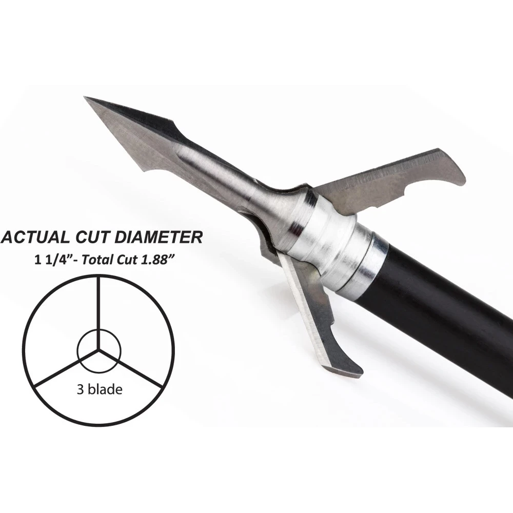 Sharp as darts and SOLID stainless from the tip of the newly designed cut-on-contact and bone-splitting “Trocrazor II” tip to the solid stainless blade-locking ferrule, NEW Fatal Steel combines multiple pieces into a single blockbusting package. The same classic look as our original heads with a one-piece mean streak! Features our original “No O-Ring” design and shock absorbing blade spring to assure superior penetration with no deflection from any angle. Shaft and tip are engineered to extend far enough to provide start-up penetration just before blades arrive for true trajectory after impact and maximum follow-through damage. Combine the fastest-opening mechanical available with the one-piece power, strength, and tool-steel sharpness of a 100% stainless steel body. FATAL STEEL! “WATCH ‘EM DROP“!